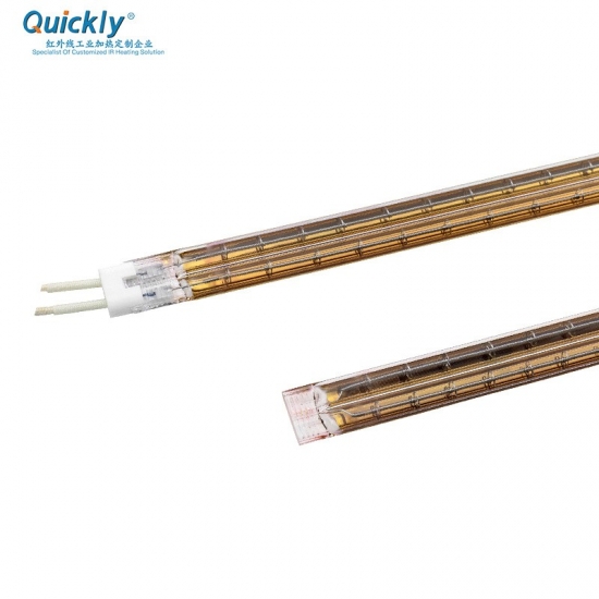 Twin tube IR emitter is made up of 8-shape high-purity clear quartz twin tube, each tube has Heating Coil of Tungsten material which runs in U shape in the tube which is filled with halogen gas.Power Density up to 150KW/m2 is achieved. Heating up and cooling down time is approximately one second. There are two standard sizes 11 mm x 23 mm and 15 mm x 33 mm in cross section for twin tube short wave IR radiators, and the maximum length available is 4000 mm